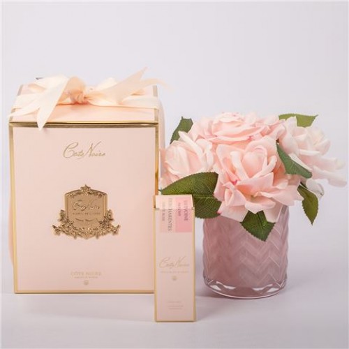 Красивая композиция из розовых роз в хрустальной вазе удивит естественным внешним видом и обновит Ваш декор и наполнит дом ароматом цветов Roses от Côte Noire. Каждый цветок искусно изготовлен вручную и имеет специальное натуральное покрытие, которое придает ему естественный оттенок и внешний вид. Утонченные французские розы выполнены настолько реалистично, словно сорваны в саду сегодня утром. Розы установлены в стеклянной вазе с гелем, наполненным прекрасным ароматом. Каждая роза красиво упакована вкоробку с лентами. Кроме того, к букету дополнительно в комплекте 2 бутылочки изысканных ароматов розы, которые распыляются на цветы, чтобы освежить и улучшить их аромат когда это необходимо.