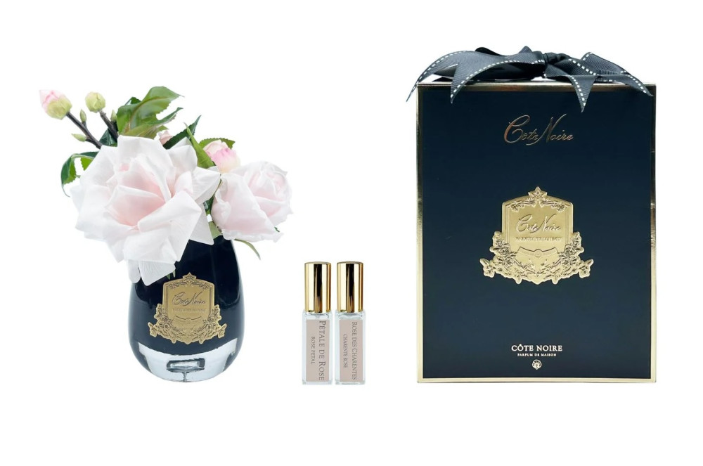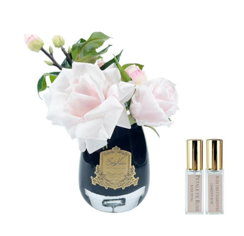 Каждая ароматизированная чайная роза, похожая на настоящую, была искусно изготовлена ​​вручную и помещена в гель, что придает ей вид воды. Каждый лепесток имеет особое натуральное покрытие, придающее им реалистичность и внешний вид. Расположены в выдувной прозрачной вазе-каплевидной форме с серебряным фирменным значком Cote Noire.