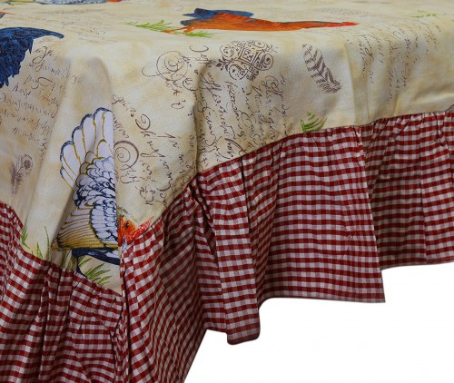 Элитная кухонная скатерть в стиле прованс, с принтом петухи, оборкой из красной клетки, с пропиткой, защищающей от промокания и грязи, это не только стильный аксессуар для кухни от Old Florence, но и яркий, солнечный акцент, способный добавить в кухню яркого света солнечной Италии. Для создания единого стиля Вы можете подобрать к скатерти Галло кухонные аксессуары в таком же дизайне: подушки, прихватки, хлебницы, полотенца и фартук с принтом или вышивкой, создавая на кухне полную гармонию и ощущения лета в Тоскане. Высокое качество изделий, ручная работа Итальянских мастеров гарантирует, что Вы будете радоваться кухонному текстилю долгое время, он сохранит все цвета, гармонию и свежесть. Создайте на кухне радостное настроение.